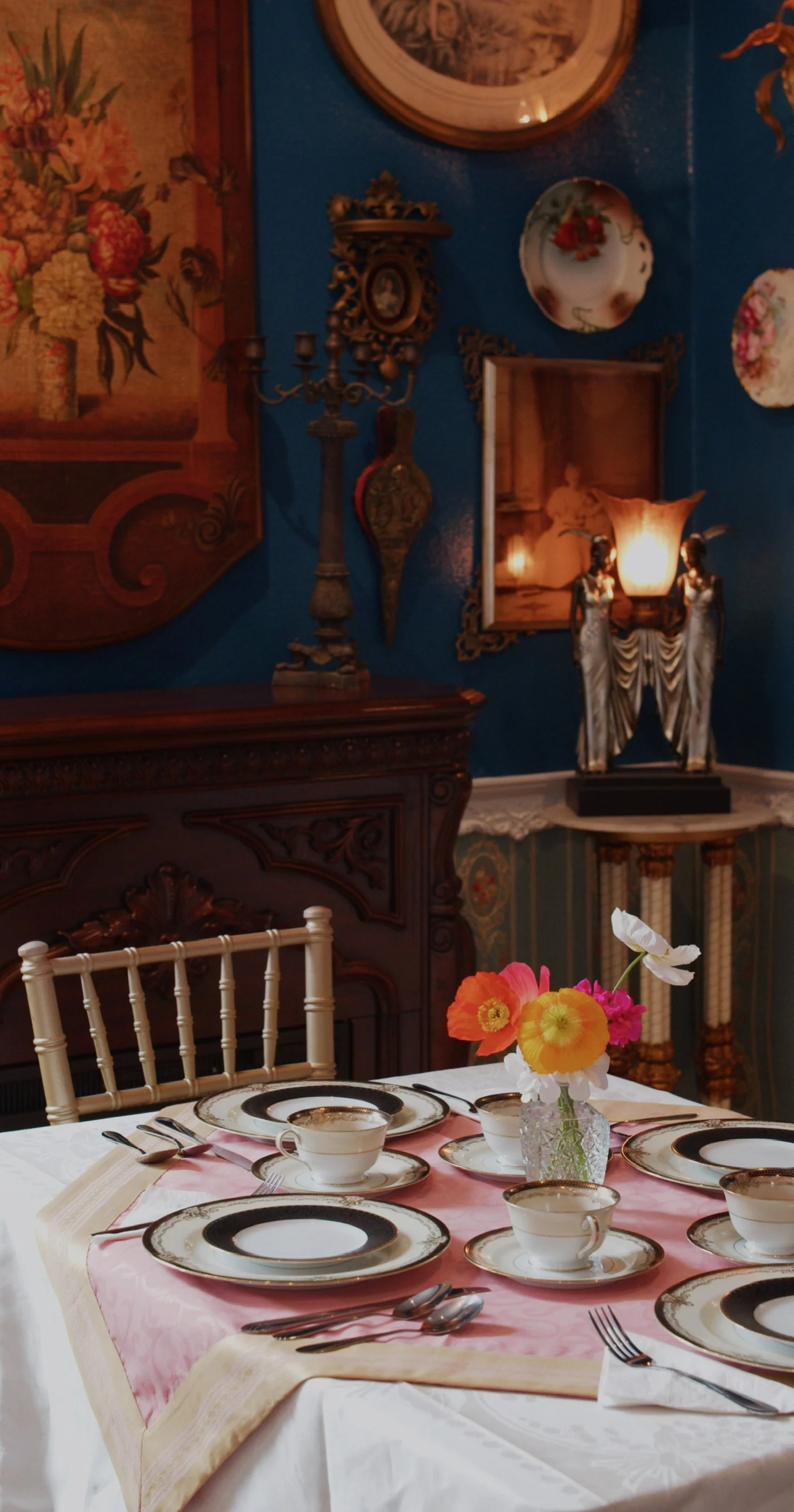 It took searching and searching for the right location for two+ years, and amassing thousands of pieces of china - full sets!! - and furniture, vintage chandeliers, vintage mirrors, artwork, etc., etc., and we just found our perfect location in a lovely 1903 house-turned-restaurant right in downtown Half Moon Bay at 724 Main Street!